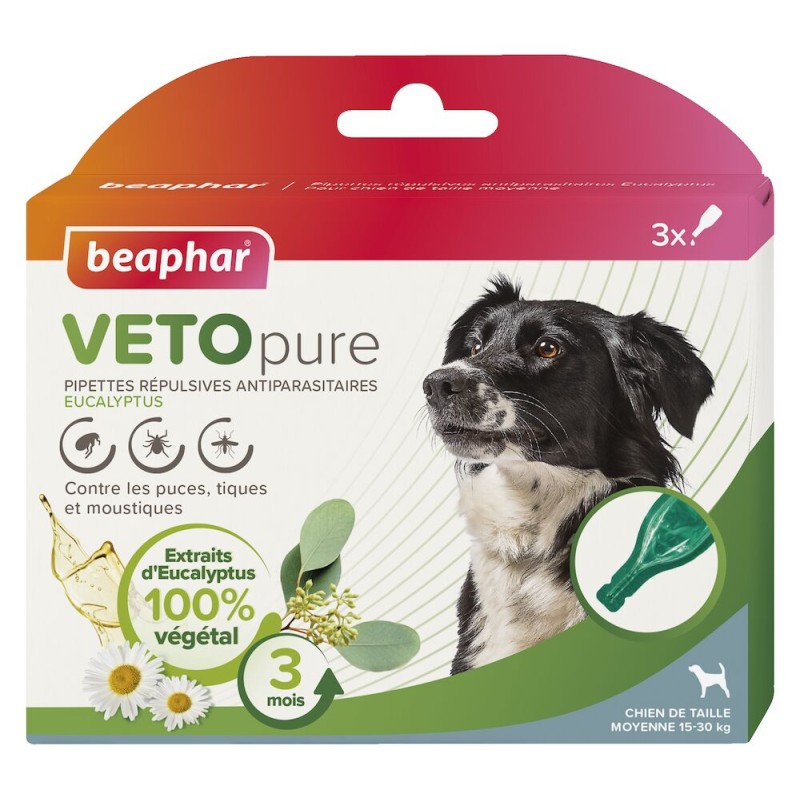 La marque Beaphar a développé la gamme naturelle VETOpure, efficace contre les puces, les tiques et les moustiques. Conçues spécialement pour les chiens, les pipettes repoussent les parasites externes, grâce à l'huile d'Eucalyptus et aux extraits de Chrysanthemum cinerariaefolium. Ces plantes sont reconnus pour leurs vertus répulsives contre les puces et les tiques. Ce produit est préventif, si vous devez faire face à une infestation massive, nous vous recommandons de traiter l’environnement de votre chien et votre habitat avec un insecticides spécial habitation.
