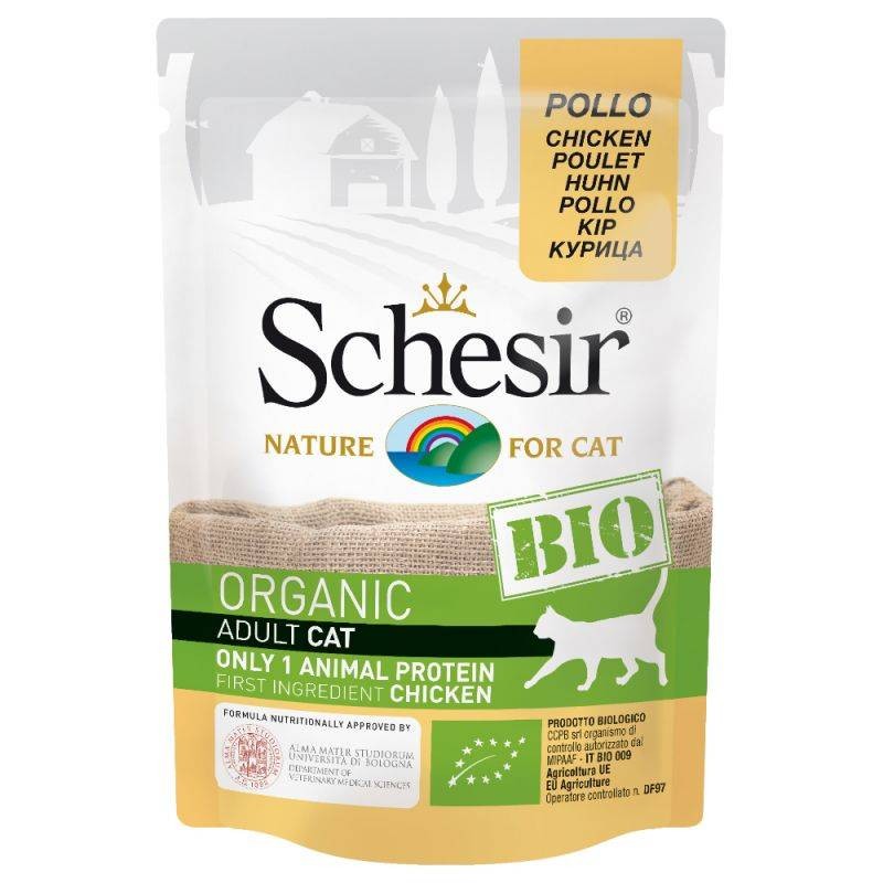 Nous vous proposons aussi les nouvelles recettes de pâtée pour chat Bio SCHESIR, une alimentation humide pour chat de grande qualité certifié bio, avec des protéines animales comme ingrédient principal, recette digeste, non testée sur les animaux.